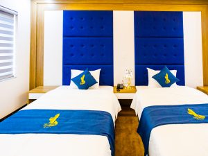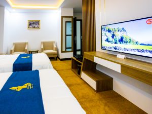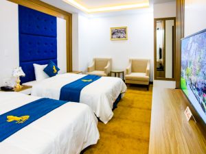 Phòng đôi tại Khách sạn Hải Anh được thiết kế để tạo ra một không gian lãng mạn và thoải mái cho cặp đôi. Phòng có không gian rộng rãi và được trang bị một giường lớn, chăn và gối cao cấp để đảm bảo giấc ngủ thoải mái. Các tiện nghi bổ sung bao gồm TV màn hình phẳng, minibar, khu vực làm việc và không gian riêng tư.